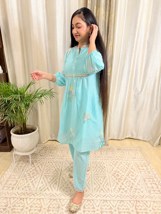 Gulmohar Teal Embroidered Kashmiri Woollen Kurti